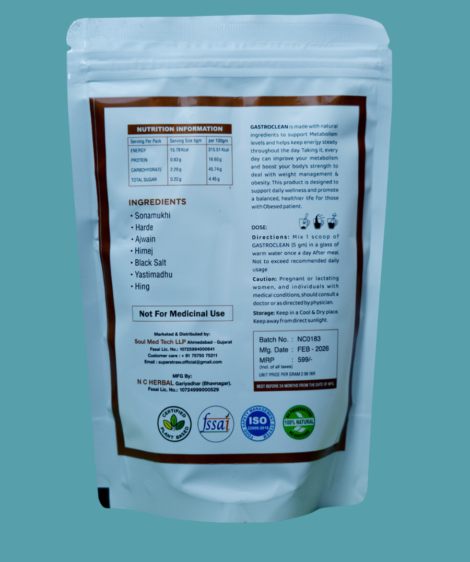 Super GastroClean is a daily health supplement featuring a traditional blend of botanicals including Sonamukhi, Harde, Ajwain, and Himej. Formulated to support your body’s natural metabolic processes and digestive wellness, just one glass a day helps maintain steady energy levels for a balanced, healthier lifestyle.